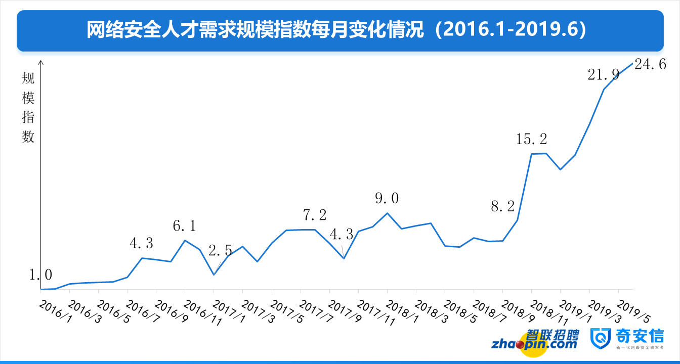 根據(jù)智聯(lián)招聘網(wǎng)絡(luò)安全人才大數(shù)據(jù)顯示,2019年6月網(wǎng)絡(luò)安全人才市場(chǎng)需求的規(guī)模達(dá)到2016年1月需求的24.6倍,相比2018年7月也增長(zhǎng)了3倍,增長(zhǎng)速度堪稱驚人!