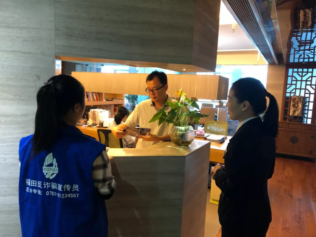 上午10時(shí),深圳市公安局福田分局派出“藍(lán)馬甲”宣傳隊(duì)走入大中華國(guó)際交易廣場(chǎng),逐層逐戶向企業(yè)員工們派發(fā)反詐騙宣傳單及《福田反詐騙教育??贰!八{(lán)馬甲”宣傳隊(duì)員走進(jìn)各企業(yè)辦公室,向企業(yè)員工派發(fā)相關(guān)資料,講解反詐騙知識(shí)。各企業(yè)員工積極參與,與“藍(lán)馬甲”講師頻頻互動(dòng),并認(rèn)真學(xué)習(xí)反詐騙技巧,努力提升自身反詐騙能力。