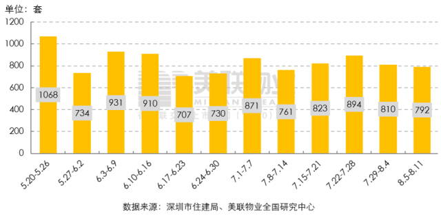 8月5日—8月11日一周內,全市共簽約成交一手住宅792套/7.3萬㎡,環(huán)比分別下降2.2%和4.9%。成交套數連續(xù)兩周小幅減少,上周成交套數降至800套以內,成為四周來的成交新低水平。