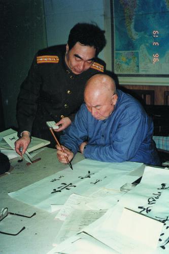 ▲1996年軍旅作家吳東峰(左)到開(kāi)國(guó)上將肖克(右)家中采訪時(shí),蕭克將軍在他墨香陣陣的書(shū)房?jī)?nèi)給他寫(xiě)下‘求實(shí)’兩個(gè)大字。