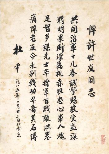 在采訪一位又一位身經(jīng)百戰(zhàn)的幸存者時(shí),吳東峰與他們的筆墨緣也就此結(jié)下?!?985年許世友將軍因病逝世,杜平將軍親手書(shū)寫(xiě)‘悼許世友同志’詩(shī)一首,請(qǐng)我送《人民日?qǐng)?bào)》刊登,我把詩(shī)傳真過(guò)去,原件保存下來(lái)了。這首詩(shī)見(jiàn)證了杜平與許世友的深厚友情,是我最早的將軍墨跡手藏。那之后,我開(kāi)始有意識(shí)地收集將軍們的筆墨?!?/p>