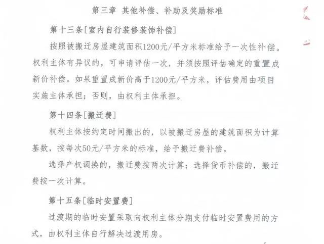 此外,室內(nèi)自行裝修裝飾補償標準,將按照被搬遷房屋建筑面積1200元 /平方米標準給予一次性補償。搬遷費以被搬遷房屋的建筑面積為計算基數(shù),按每次50元 /平方米的標準,給予搬遷費補償。