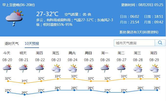 記者從深圳市氣象臺獲悉,未來5天深圳天氣炎熱,多陣雨。其中,20日多云有陣雨或雷陣雨,部分時(shí)間可見陽光,氣溫26℃至32℃,中午前后較為悶熱;21日多云為主,有(雷)陣雨;22日至24日多云間晴天,局部有短時(shí)(雷)陣雨,天氣悶熱。展望25日至26日多云,有(雷)陣雨。