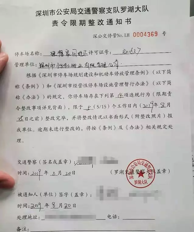 深圳交警巡查至深圳市怡和物業(yè)有限管理公司理想家園地下停車場(chǎng)時(shí),發(fā)現(xiàn)該停車場(chǎng)數(shù)據(jù)未與停車場(chǎng)監(jiān)管系統(tǒng)正常連接,民警按照停車場(chǎng)管理制度向該停車場(chǎng)負(fù)責(zé)人開(kāi)具責(zé)令限期整改通知書(shū)。