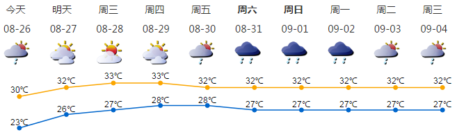 我市大雨轉(zhuǎn)陣雨;氣溫23-30℃;西南風(fēng)3級(jí);相對濕度65%-95%。