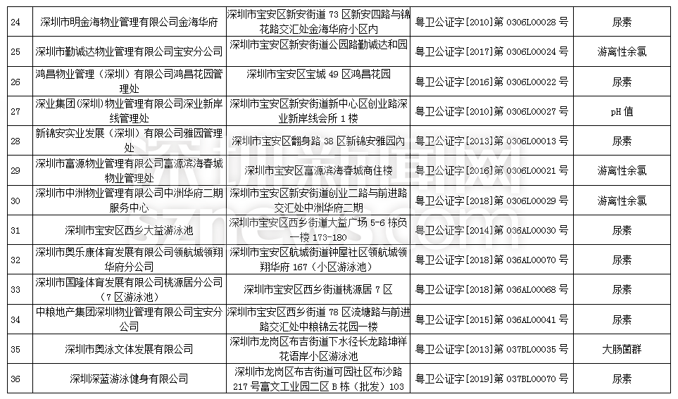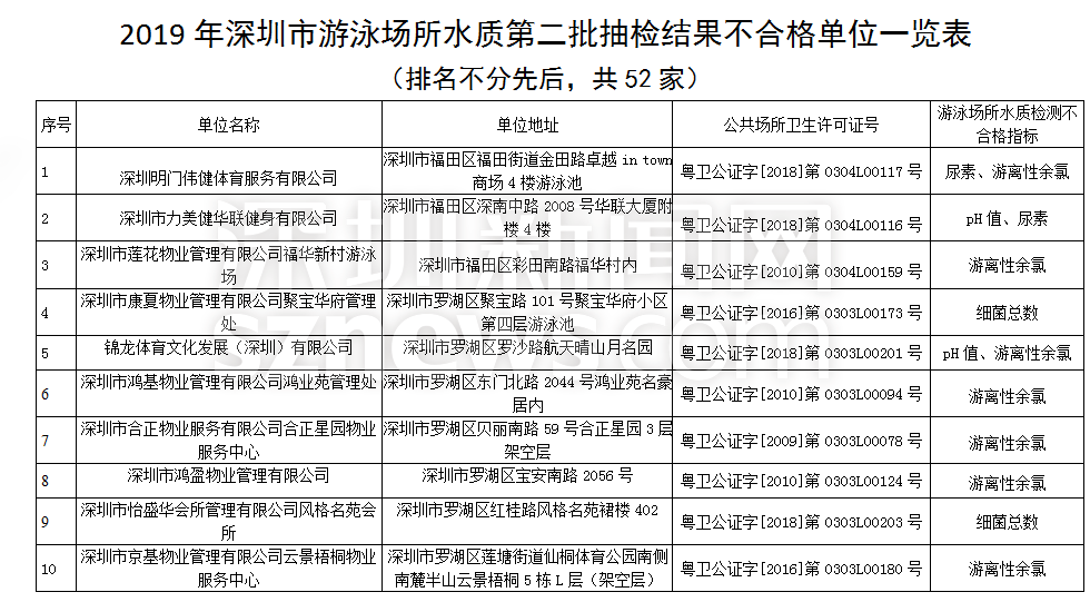 見圳客戶端·深圳新聞網(wǎng)2019年8月29日訊(見圳客戶端、深圳新聞網(wǎng)記者 劉夢婷 通訊員 深衛(wèi)監(jiān))深圳市衛(wèi)生健康委近期組織了各級衛(wèi)生監(jiān)督機(jī)構(gòu)對全市游泳場所水質(zhì)進(jìn)行了分批專項抽樣檢驗,并在近日公布了2019年第二批游泳場所水質(zhì)抽檢結(jié)果。第二批共抽檢游泳場所451家,檢測指標(biāo)為游離性余氯、渾濁度、尿素、pH值、細(xì)菌總數(shù)、大腸菌群等六項。抽檢的451家游泳場所中,合格399家,合格率為88.47%,不合格52家,不合格率為11.53%;不合格指標(biāo)主要為游離性余氯、尿素、細(xì)菌總數(shù)、pH值和大腸菌群。