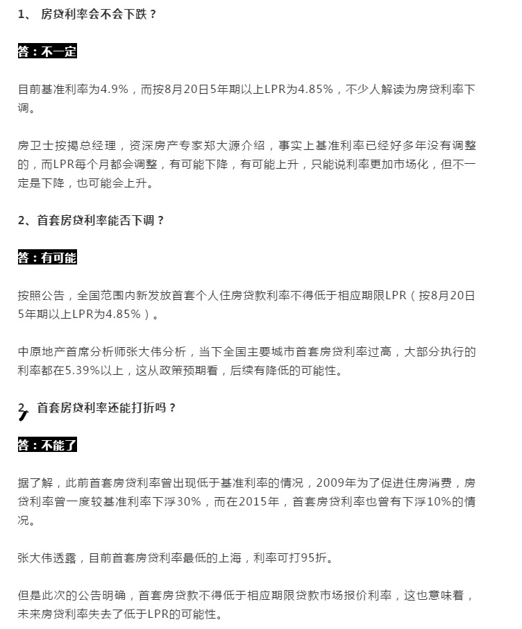 全國范圍內(nèi)新發(fā)放首套個人住房貸款利率不得低于相應(yīng)期限LPR(按8月20日5年期以上LPR計算為4.85%);