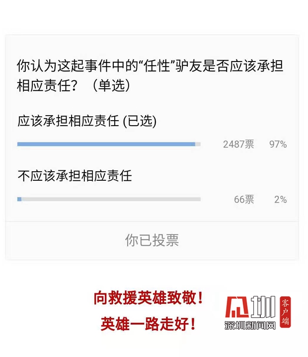 有一個細節(jié)是,這批受困的驢友上山溯溪的時間正是深圳發(fā)布臺風預警信號的時間,因此很多人也認為在臺風天探險,驢友過于任性。在深圳新聞網(wǎng)微信公眾號發(fā)起的小調(diào)查(你認為這起事件中的“任性”驢友是否應該承擔相應責任?(單選))中,共有2553名網(wǎng)友作答,97%的人認為應該承擔相應責任。
