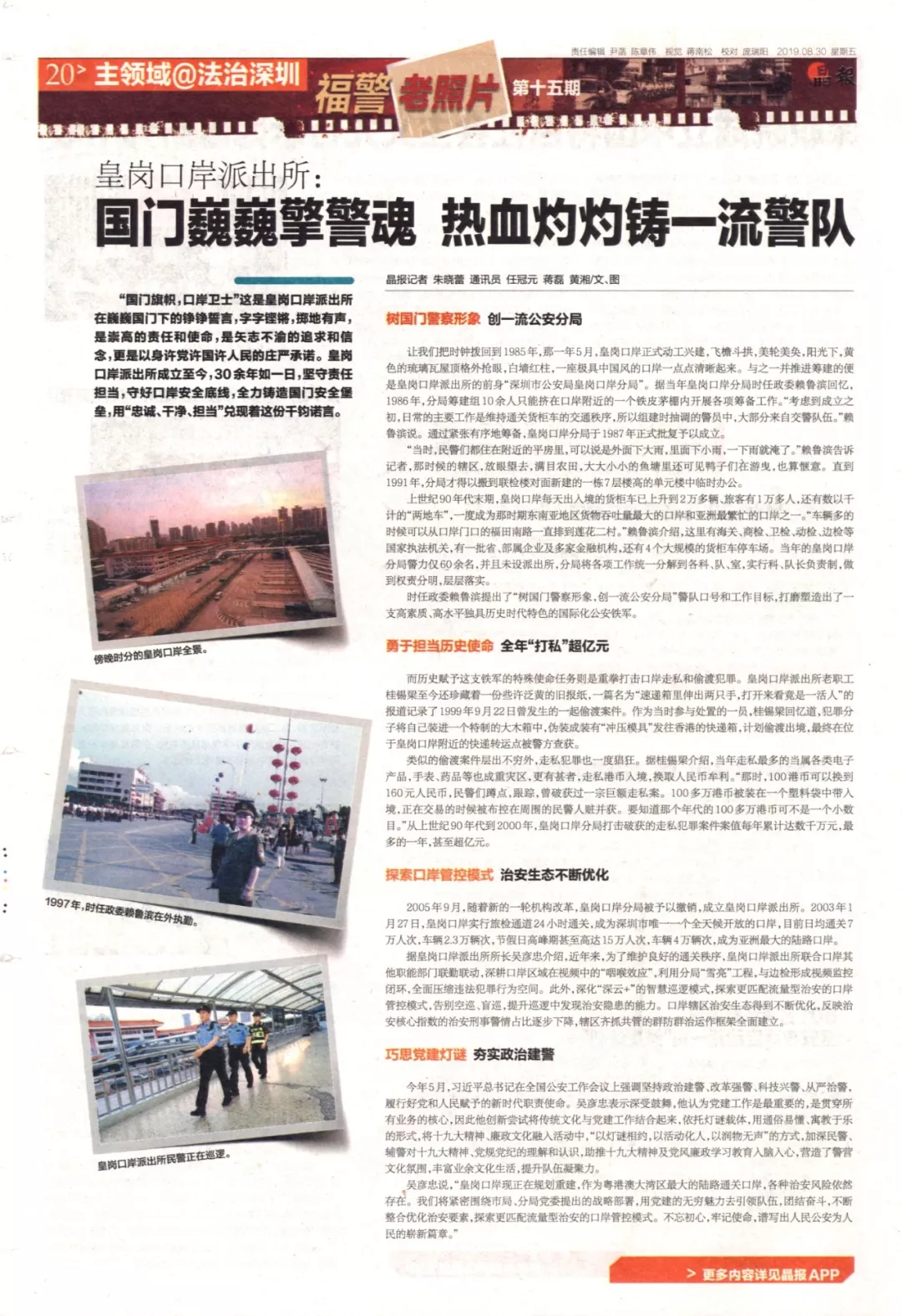 上世紀(jì)90年代末期,皇崗口岸每天出入境的貨柜車(chē)已上升到2萬(wàn)多輛、旅客有1萬(wàn)多人,還有數(shù)以千計(jì)的“兩地車(chē)”,一度成為那時(shí)期東南亞地區(qū)貨物吞吐量最大的口岸和亞洲最繁忙的口岸之一?!败?chē)輛多的時(shí)候可以從口岸門(mén)口的福田南路一直排到蓮花二村。”賴(lài)魯濱介紹,這里有海關(guān)、商檢、衛(wèi)檢、動(dòng)檢、邊檢等國(guó)家執(zhí)法機(jī)關(guān),有一批省、部屬企業(yè)及多家金融機(jī)構(gòu),還有4個(gè)大規(guī)模的貨柜車(chē)停車(chē)場(chǎng)。當(dāng)年的皇崗口岸分局警力僅60余名,并且未設(shè)派出所,分局將各項(xiàng)工作統(tǒng)一分解到各科、隊(duì)、室,實(shí)行科、隊(duì)長(zhǎng)負(fù)責(zé)制,做到權(quán)責(zé)分明,層層落實(shí)。
