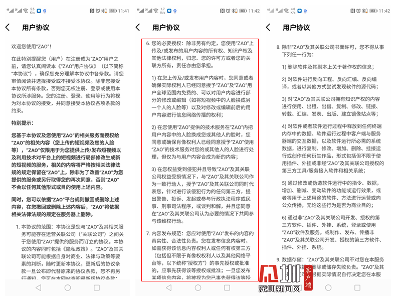 見圳客戶端.深圳新聞網(wǎng)2019年9月3日訊(見圳客戶端、深圳新聞網(wǎng)記者 張玲)從一夜爆紅,到爭議不斷,AI換臉APP“ZAO”三天內(nèi)體會到“過山車”般的口碑暴跌——由于其面部識別功能,及其《用戶協(xié)議》(簡稱“協(xié)議”)引起了網(wǎng)絡(luò)上的激烈討論。有人擔(dān)憂“ZAO”借此軟件搜集用戶面部識別信息向第三方銷售牟取暴利。