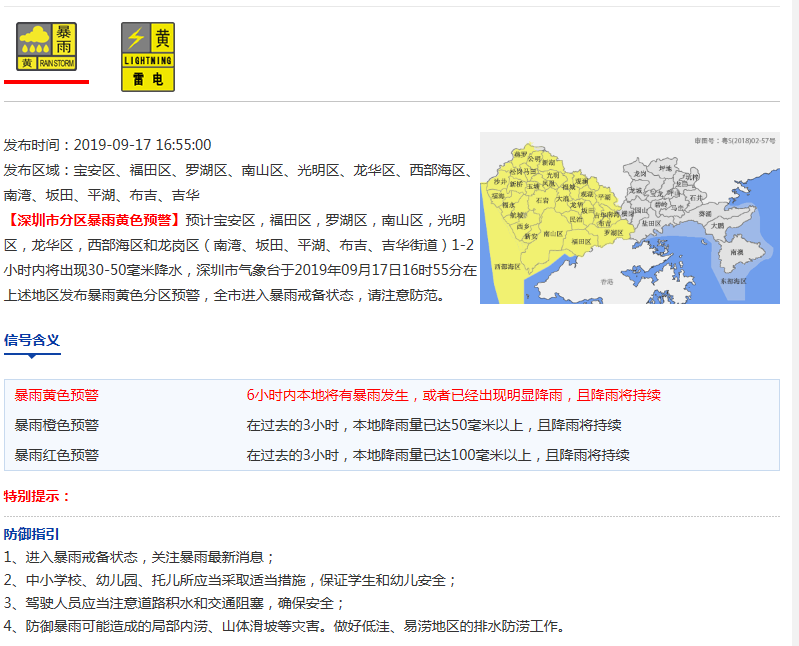 市氣象局預計寶安區(qū),福田區(qū),羅湖區(qū),南山區(qū),光明區(qū),龍華區(qū),西部海區(qū)和龍崗區(qū)(南灣、坂田、平湖、布吉、吉華街道)1-2小時內(nèi)將出現(xiàn)30-50毫米降水,深圳市氣象臺于2019年09月17日16時55分在上述地區(qū)發(fā)布暴雨黃色分區(qū)預警,全市進入暴雨戒備狀態(tài),請注意防范。