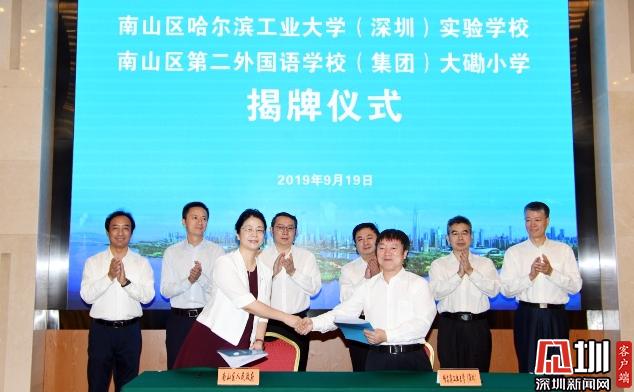 活動中,南山區(qū)哈爾濱工業(yè)大學(深圳)實驗學校及南山區(qū)第二外國語學校(集團)大磡小學兩所學校正式揭牌。南山區(qū)委書記王強,哈工大(深圳)黨委書記吳德林,南山區(qū)委副書記、代區(qū)長黃湘岳,深圳大學城管理辦公室副主任戴興毅、哈工大(深圳)副校長姚英學、南山區(qū)副區(qū)長練聰、哈工大(深圳)工會負責人張敏等出席簽約儀式,并為兩所新校揭牌。南山區(qū)政協(xié)副主席、區(qū)教育局局長劉根平主持儀式。