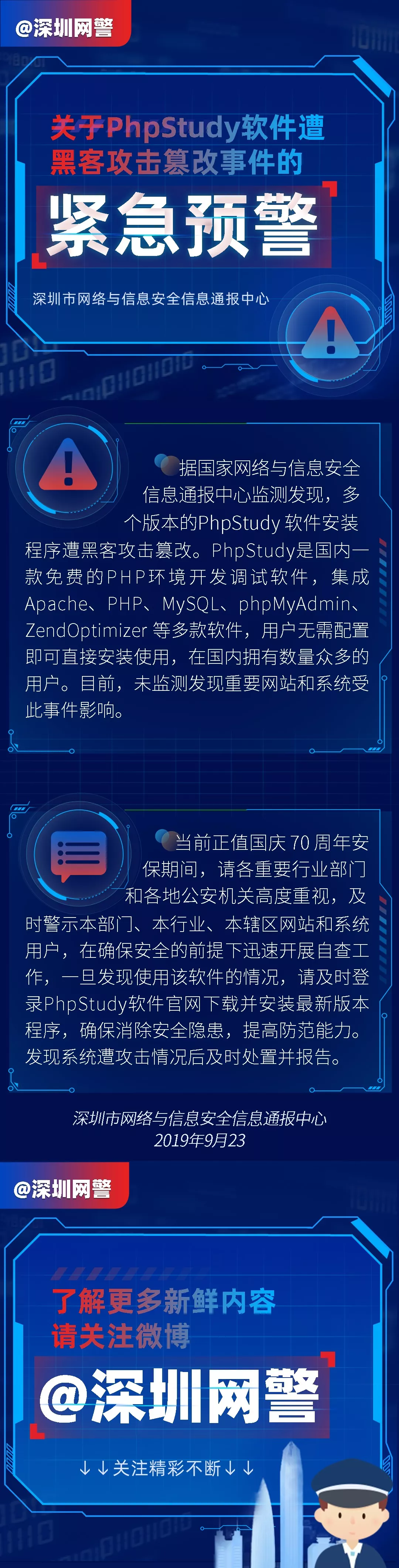 當(dāng)前正值國慶70周年安保期間,請各重要行業(yè)部門和各地公安機(jī)關(guān)高度重視,及時警示本部門、本行業(yè)、本轄區(qū)網(wǎng)站和系統(tǒng)用戶,在確保安全的前提下迅速開展自查工作。