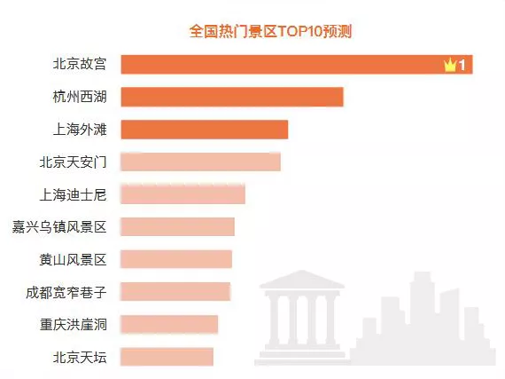 根據(jù)交通運(yùn)輸部科學(xué)研究院報(bào)告顯示,國慶全國熱門景區(qū)TOP10北京故宮、杭州西湖、上海外灘位列前三位,另外還有北京天安門、上海迪士尼、嘉興烏鎮(zhèn)風(fēng)景區(qū)、黃山風(fēng)景區(qū)、成都寬窄巷子、重慶洪崖洞、北京天壇位列其中。