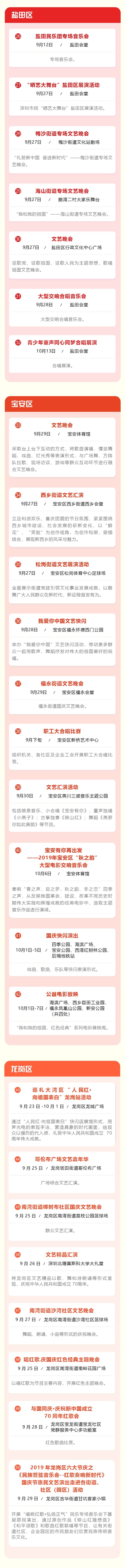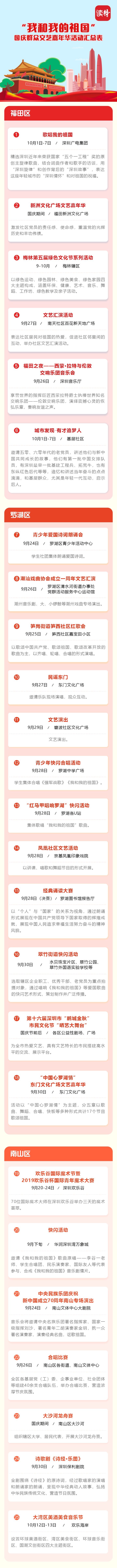 深圳特區(qū)報(bào)2019年9月26日訊 為熱烈慶祝中華人民共和國成立70周年,深圳市將舉辦規(guī)模盛大的全市性專場音樂會、群眾文藝晚會、焰火晚會等活動,同時(shí)將在各區(qū)舉辦80場“我和我的祖國”國慶群眾文藝嘉年華活動,并在全市各區(qū)舉行“愛我中華——南粵百園慶國慶”主題游園。各有關(guān)活動安排如下: