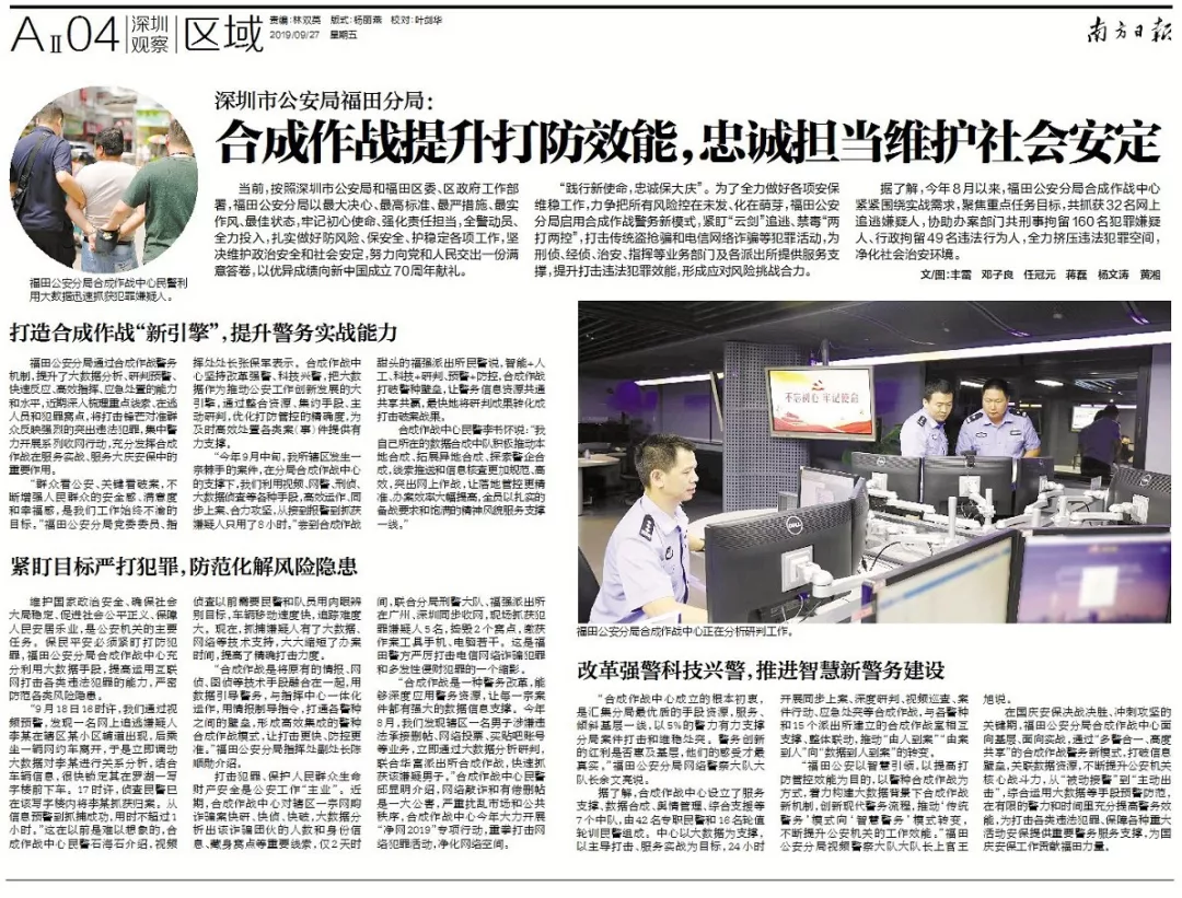 在大慶安保決戰(zhàn)決勝、沖刺攻堅(jiān)的關(guān)鍵期,福田公安分局合成作戰(zhàn)中心面向基層、面向?qū)崙?zhàn),通過(guò)“多警合一、高度共享”的合成作戰(zhàn)警務(wù)新模式,打破信息壁壘,關(guān)聯(lián)數(shù)據(jù)資源,不斷提升公安機(jī)關(guān)核心戰(zhàn)斗力,從“被動(dòng)接警”到“主動(dòng)出擊”,綜合運(yùn)用大數(shù)據(jù)等手段預(yù)警防范,為在有限的警力和時(shí)間里充分提高警務(wù)效能,為打擊各類違法犯罪、保障各種重大活動(dòng)安保提供重要警務(wù)服務(wù)支撐,為大慶安保工作貢獻(xiàn)福田力量。
