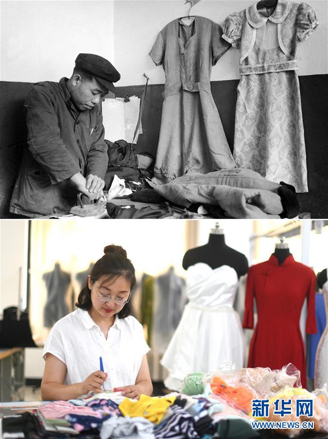 拼版照片:上圖為1957年,天津市縫紉供銷社職工在用舊大褂改制當(dāng)時女性流行的服裝——“布拉吉”(俄語“連衣裙”的音譯)(新華社記者梁一丁攝);下圖為2019年6月20日,天津工業(yè)大學(xué)針織與針織服裝系教師匡麗赟在學(xué)校教室使用服裝企業(yè)廢棄的舊面料進行創(chuàng)作(新華社記者岳月偉攝)。