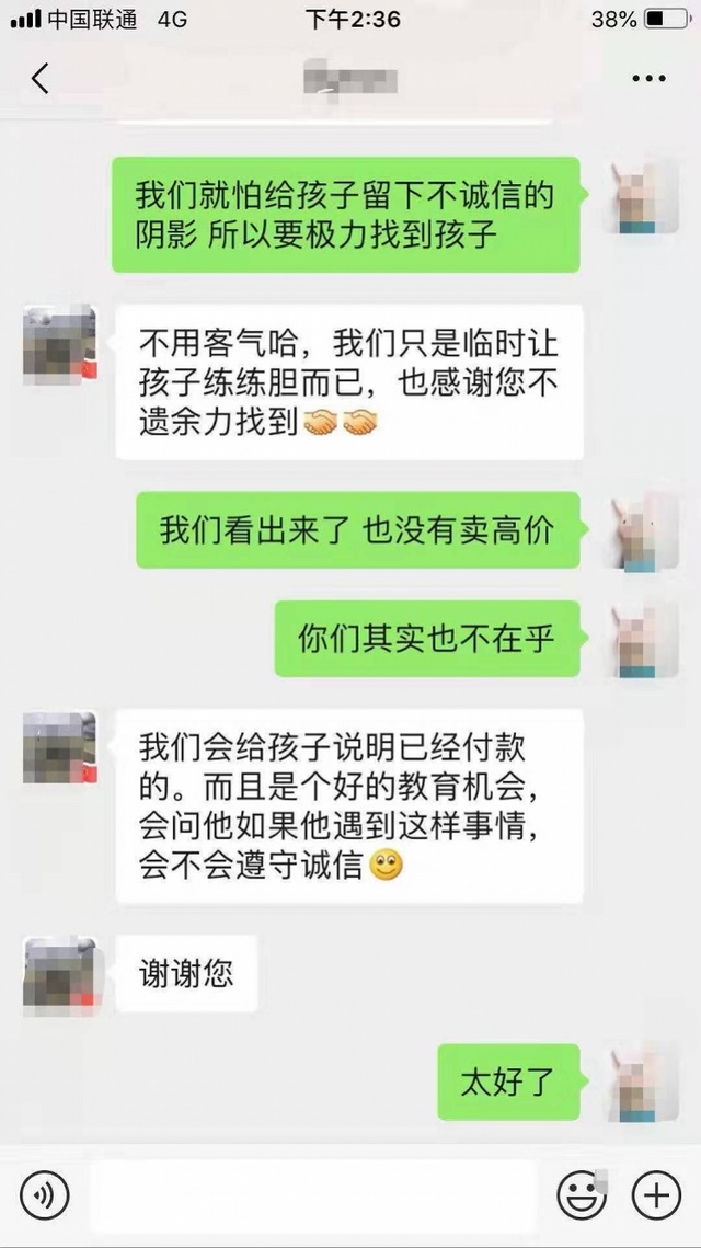 賣水男孩爸爸告訴張先生,他是從朋友的轉(zhuǎn)發(fā)中,看到這個消息的。他介紹說,他們那天只是臨時讓孩子練練膽,并對張先生努力尋找孩子,實(shí)現(xiàn)對孩子承諾的誠信行為表示感謝?!拔視o孩子說明已經(jīng)付款的,而且這是個好的教育機(jī)會,我會問他,如果他遇到這樣的事情,會不會遵守誠信?!辟u水男孩爸爸告訴張先生,“沒有想到你為了守護(hù)一份誠信,借助網(wǎng)絡(luò)媒體的力量,花大力氣尋找并支付礦泉水錢,這份堅(jiān)持,讓我們和孩子都非常感動。我們也已經(jīng)與孩子溝通整件事情,并借此機(jī)會告訴他換位思考,如果遇到類似情況,也應(yīng)堅(jiān)持誠信、與人為善的傳統(tǒng)美德?!?/p>