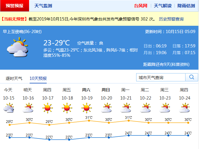 見圳客戶端·深圳新聞網(wǎng)2019年10月15日訊 記者從深圳市氣象局了解到,今日深圳多云,可見陽光;氣溫23-29℃,有些許涼意;東北風3級,沿海、高地和海區(qū)最大陣風7-8級;16-21日再轉(zhuǎn)晴天干燥天氣,早晚氣溫舒適,適宜戶外活動。