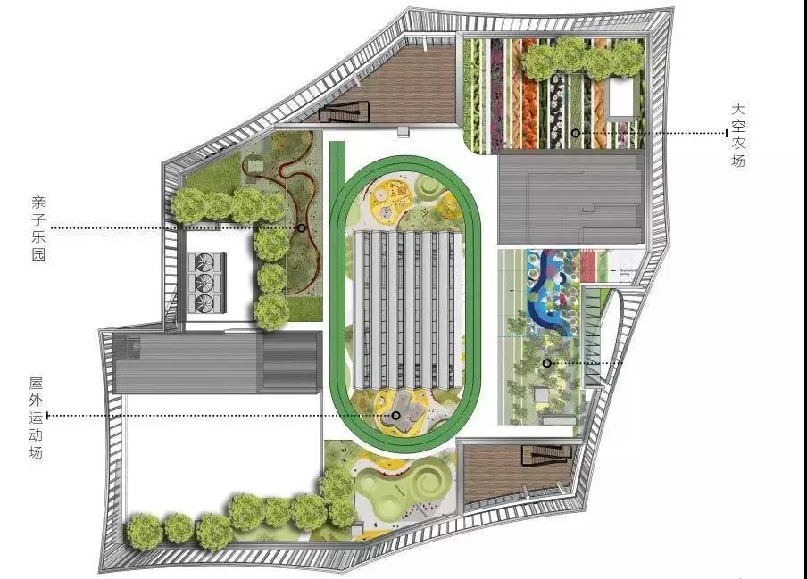 屋頂農(nóng)場充分利用空間,打造天空農(nóng)場、親子樂園、屋外運(yùn)動場。空中的跑道,肥沃的土壤,瓜果蔬菜的金色豐收,讓自然在城市落地生根。小朋友們可以在其中,種植汗水,開花結(jié)果,收獲自然的饋贈。