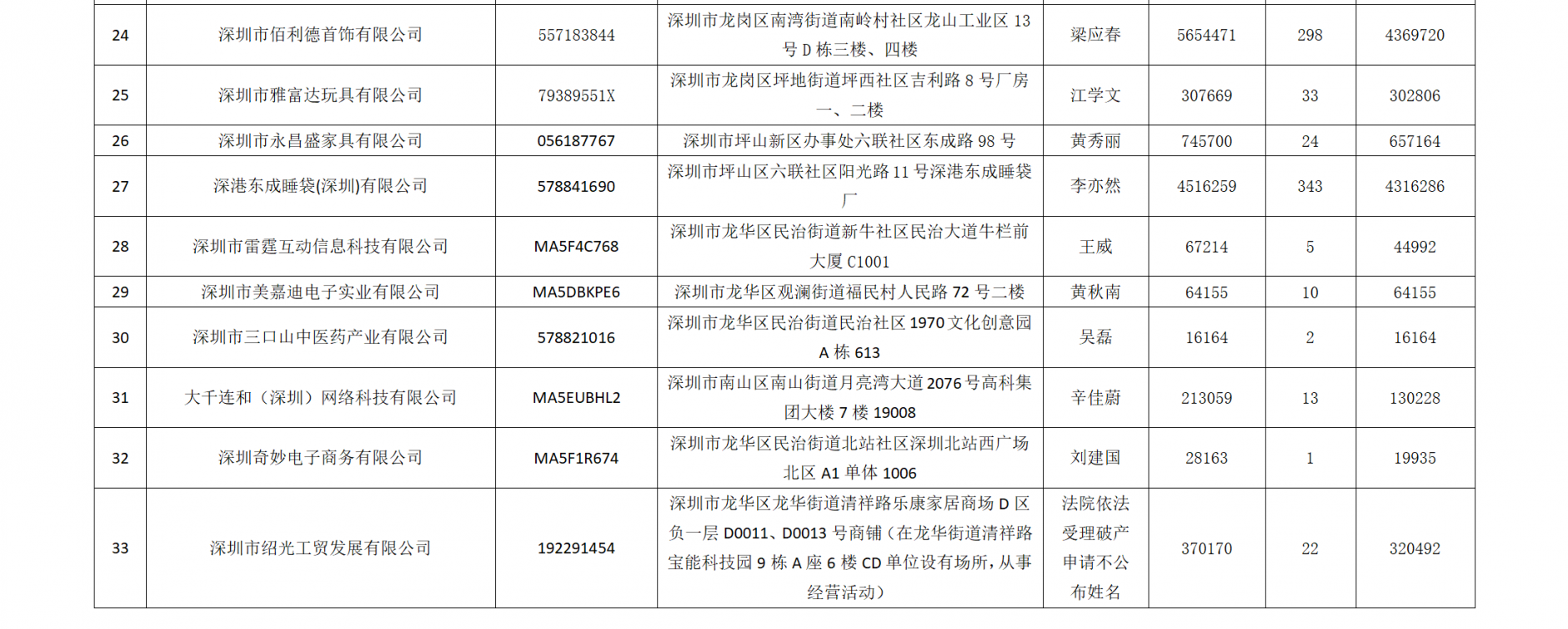 記者發(fā)現(xiàn),在此次被曝光的33家企業(yè)中,被墊付欠薪數(shù)額最大的是位于龍崗區(qū)南灣街道南嶺村社區(qū)龍山工業(yè)區(qū)的深圳市佰利德首飾有限公司,拖欠員工工資約565.45萬元,市欠薪保障基金墊付298名員工工資436.97萬元;其次是位于坪山區(qū)六聯(lián)社區(qū)的深港東成睡袋(深圳)有限公司,拖欠員工工資約451.63萬元,市欠薪保障基金墊付343名員工工資約431.63萬元。