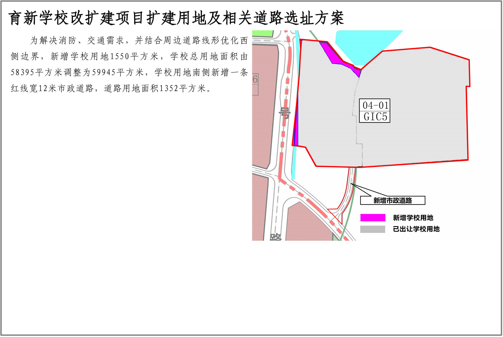 深圳市育新學校位于光明街道碧眼社區(qū),規(guī)劃觀光路(現狀已建)和二十三號路(現狀已建)交叉口西北側。為消除校園消防、交通出行安全隱患,滿足規(guī)范需求,新增學校用地1550平方米,以解決消防、交通需求,并結合周邊道路線形優(yōu)化西側邊界,學??傆玫孛娣e由58395平方米調整為59945平方米,學校用地南側新增一條紅線寬12米市政道路,道路用地面積1352平方米。