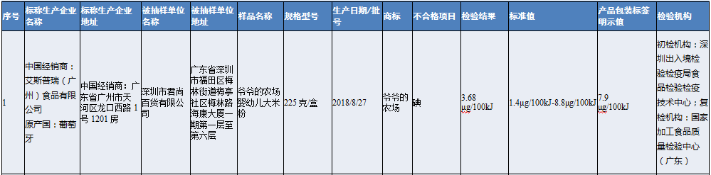 深圳市君尚百貨有限公司銷售的爺爺?shù)霓r(nóng)場(chǎng)嬰幼兒大米粉(原產(chǎn)國:葡萄牙),其中碘檢出值低于產(chǎn)品包裝標(biāo)簽明示值的80%,營養(yǎng)指標(biāo)不達(dá)標(biāo)。