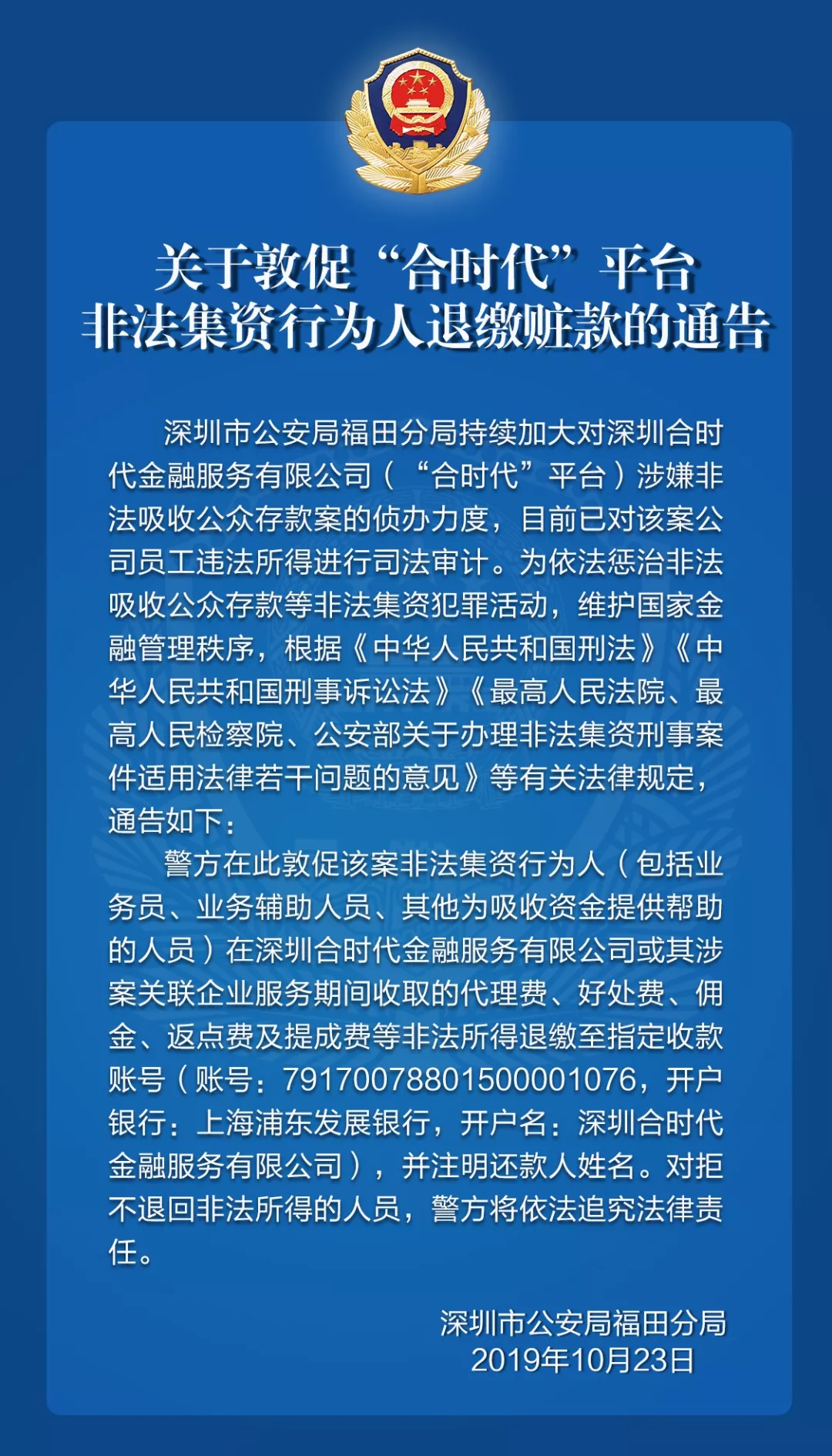 關(guān)于敦促“合時(shí)代”平臺非法集資行為人退繳贓款的通告