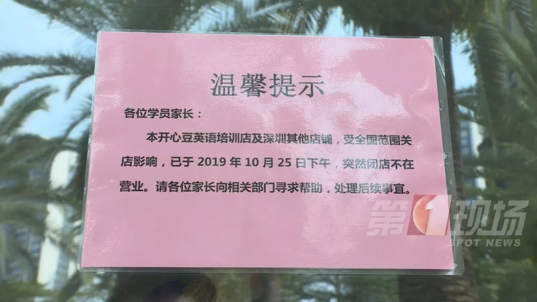 同時,家住龍崗的多名家長,今天也聚集在、鳳凰城商業(yè)中心里的一家開心豆少兒英語門前。這家店同樣是悄無聲息結(jié)業(yè)倒閉,人去樓空。商場管理方也貼出公告稱,這家店9月起就欠租,目前平湖長廊警務室已成立專門工作組。