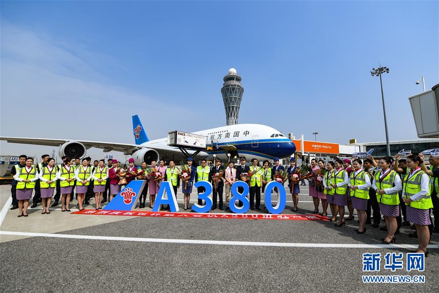 10月27日,機組、地勤人員等慶祝空中客車A380客機重返深圳機場。當(dāng)日下午,由全球最大寬體客機——空中客車A380執(zhí)飛的南航CZ3153次航班由深圳起飛前往北京,標(biāo)志著這款“空中巨無霸”機型重返深圳機場。南航曾在2014年5月開始啟用A380執(zhí)飛京深航線,后因動態(tài)運力調(diào)配停飛。新華社記者毛思倩攝