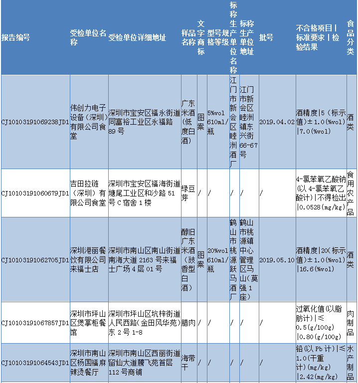 見圳客戶端 ·深圳新聞網(wǎng)2019年11月6日訊 11月5日,深圳市市場(chǎng)監(jiān)督管理局發(fā)布2019年第四十期食品安全抽樣檢驗(yàn)情況通報(bào),通報(bào)稱,深圳市市場(chǎng)監(jiān)督管理局于2019年8-9月組織對(duì)我市餐飲環(huán)節(jié)的食品開展了抽樣檢驗(yàn)工作,本次共抽檢餐飲環(huán)節(jié)食品671批次,涉及餐飲環(huán)節(jié)經(jīng)營(yíng)主體584家次,共檢測(cè)食品指標(biāo)3385項(xiàng)次。其中檢出不合格樣品12批次,涉及不合格食品類別有酒類2批次均為米酒;肉制品2批次為臘肉和臘鴨腿;食糖1批次、食用農(nóng)產(chǎn)品5批次牛蛙、豬肝等在列;蔬菜制品1批次、水產(chǎn)制品1批次。
