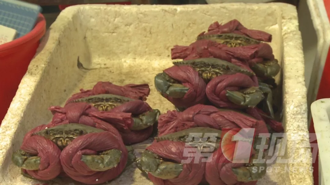 ▲粗大的紅色綁蟹繩,吸水后重半斤,這樣的膏蟹商家賣85元/斤。