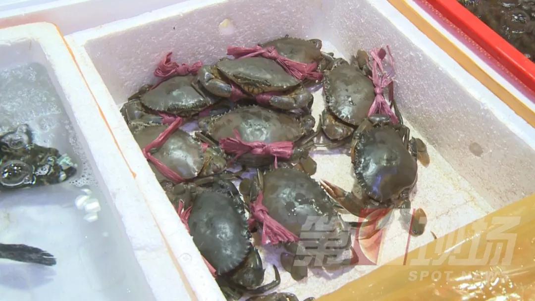 ▲羅芳水產批發(fā)市場內,膏蟹用白色塑料繩來捆綁。