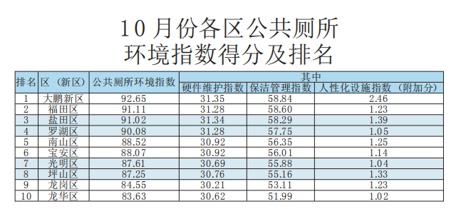 龍華、龍崗兩區(qū)已多次在公廁環(huán)境指數(shù)測評(píng)中排名墊底,應(yīng)當(dāng)引起重視,學(xué)習(xí)先進(jìn),加強(qiáng)“廁所革命”力度進(jìn)度,全面消除轄區(qū)公廁短板。