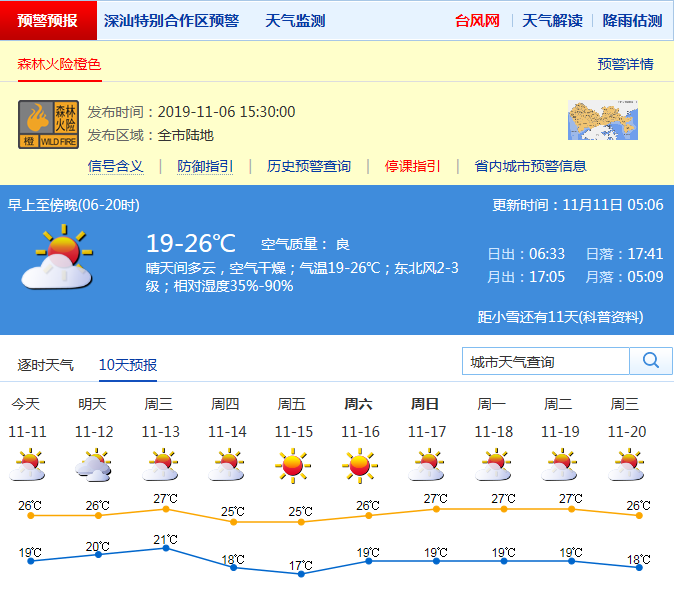 見圳客戶端·深圳新聞網2019年11月11日訊 最近鵬城天氣,終于有了一絲絲涼意,有點秋高氣爽的感覺了。剛剛過去的周末,全市晴天間多云,氣溫18℃-27℃。全市森林火險橙色預警信號生效中。