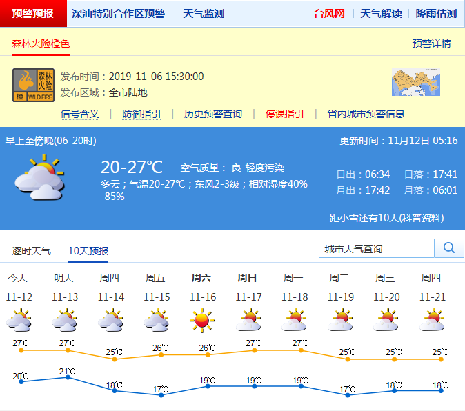 深圳市氣象局預(yù)計(jì)12日多云,早晚有輕霧或輕度霾,空氣干燥, 氣溫20-27℃;東北風(fēng)2-3級(jí);相對(duì)濕度40%-90% 。12日多云,早晚有輕霧或霾,20-27℃;13日夜間至14日有冷空氣影響,風(fēng)力加大,最大陣風(fēng)7-8級(jí),氣溫下降3℃左右;15-18日晴天。