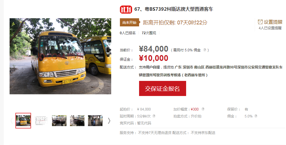 競(jìng)買人應(yīng)于拍賣會(huì)前在京東拍賣平臺(tái)進(jìn)行實(shí)名登記注冊(cè),注冊(cè)成功后請(qǐng)按京東拍賣平臺(tái)的提示進(jìn)行操作;競(jìng)買人在對(duì)拍賣標(biāo)的物首次確認(rèn)出價(jià)競(jìng)拍前,按系統(tǒng)提示報(bào)名繳納10000元/輛的保證金;在競(jìng)價(jià)過程中,請(qǐng)競(jìng)買人按規(guī)定的加價(jià)幅度300元出價(jià),若自行出價(jià),請(qǐng)仔細(xì)核對(duì)好出價(jià)金額,若出現(xiàn)出價(jià)金額錯(cuò)誤的情況,由買受人自行承擔(dān)后果;拍賣成交后,買受人請(qǐng)于拍賣成交之時(shí)起72小時(shí)內(nèi)全額支付拍賣成交價(jià)款、拍賣傭金、增值稅及附加、機(jī)動(dòng)車轉(zhuǎn)移登記車牌費(fèi),并到廣東華士德(深圳)拍賣行有限公司所在地(深圳市羅湖區(qū)中興路219號(hào)華興酒店4樓)簽署《拍賣成交確認(rèn)書》及辦理相關(guān)手續(xù)。