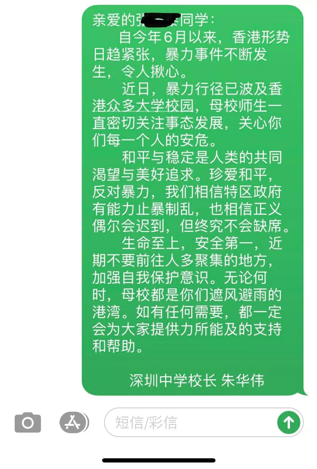 此外,深圳中學(xué)校長朱華偉還向在港的深中學(xué)子發(fā)送了問候短信,希望他們多注意自身安全,“無論如何,母校都是你們遮風(fēng)避雨的港灣”,讓收到短信的學(xué)子倍感溫暖。