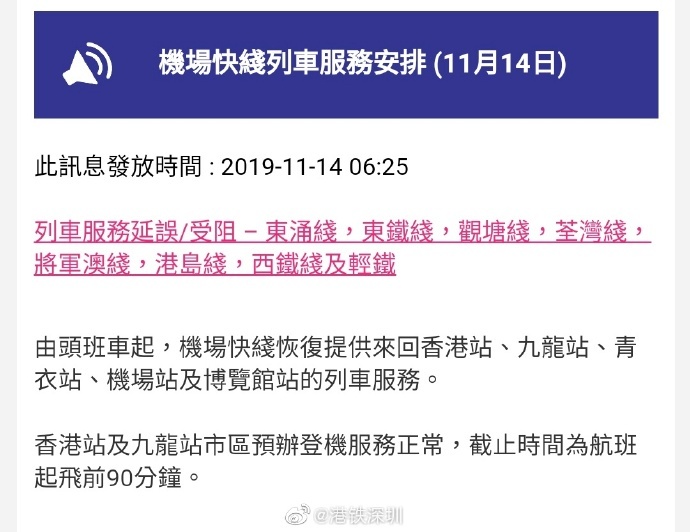 據(jù)港鐵官網(wǎng)目前最新消息,11月14日,港鐵各線(機場快線除外)、輕鐵及港鐵巴士的服務將于晚上10時結束,東涌線、東鐵線、觀塘線、荃灣線、將軍澳線、港島線、西鐵線及輕鐵列車服務延誤/受阻。