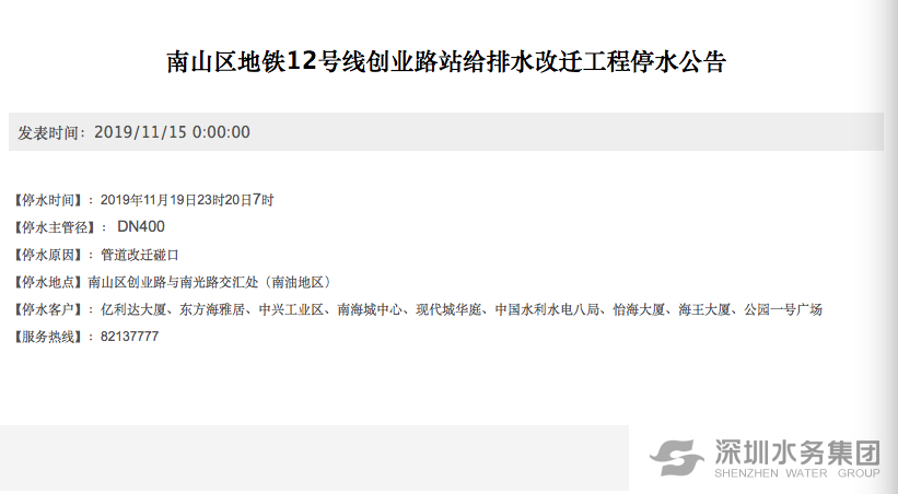 為配合南山區(qū)地鐵12號(hào)線創(chuàng)業(yè)路站給排水改遷工程,深圳水務(wù)集團(tuán)計(jì)劃于11月19日23時(shí)20日7時(shí),對(duì)南山區(qū)創(chuàng)業(yè)路與南光路交匯處DN400供水管道進(jìn)行改遷碰口,屆時(shí)南油地區(qū)暫停供水。具體影響用戶為:億利達(dá)大廈、東方海雅居、中興工業(yè)區(qū)、南海城中心、現(xiàn)代城華庭、中國水利水電八局、怡海大廈、海王大廈、公園一號(hào)廣場。
