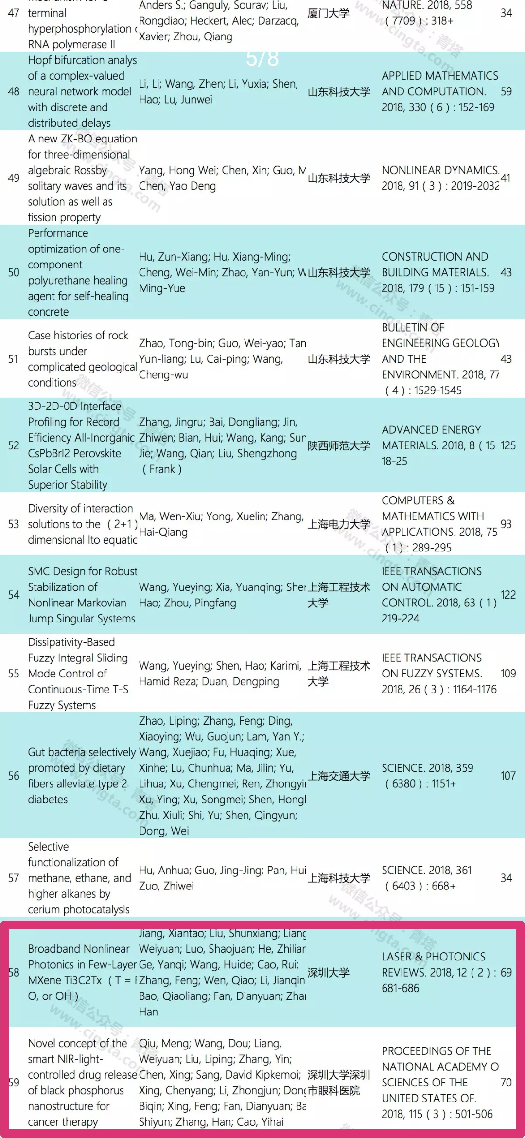 張晗教授課題組入選的2篇論文分別為《Broadband Nonlinear Photonics in Few-Layer MXene Ti3C2Tx (T = F, O, or OH)(新型智能近紅外光控黑磷納米結(jié)構(gòu)釋藥系統(tǒng)用于癌癥治療)》,所屬機(jī)構(gòu)為深圳大學(xué),來(lái)源期刊為《LASER & PHOTONICS REVIEWS.2018,12(2):681-686(美國(guó)科學(xué)院院刊)》,被引次數(shù)69;《Novel concept of the smart NIR-light-controlled drug release of black phosphorus nanostructure for cancer therapy(少層MXene納米片中的非線性光子學(xué))》,所屬機(jī)構(gòu)為深圳大學(xué)深圳市眼科醫(yī)院,來(lái)源期刊為《PROCEEDINGS OF THE NATIONAL ACADEMY OF SCIENCES OF THE UNITED STATES OF.2018,115(3):501-506(激光光子學(xué)評(píng)論)》,被引次數(shù)70。