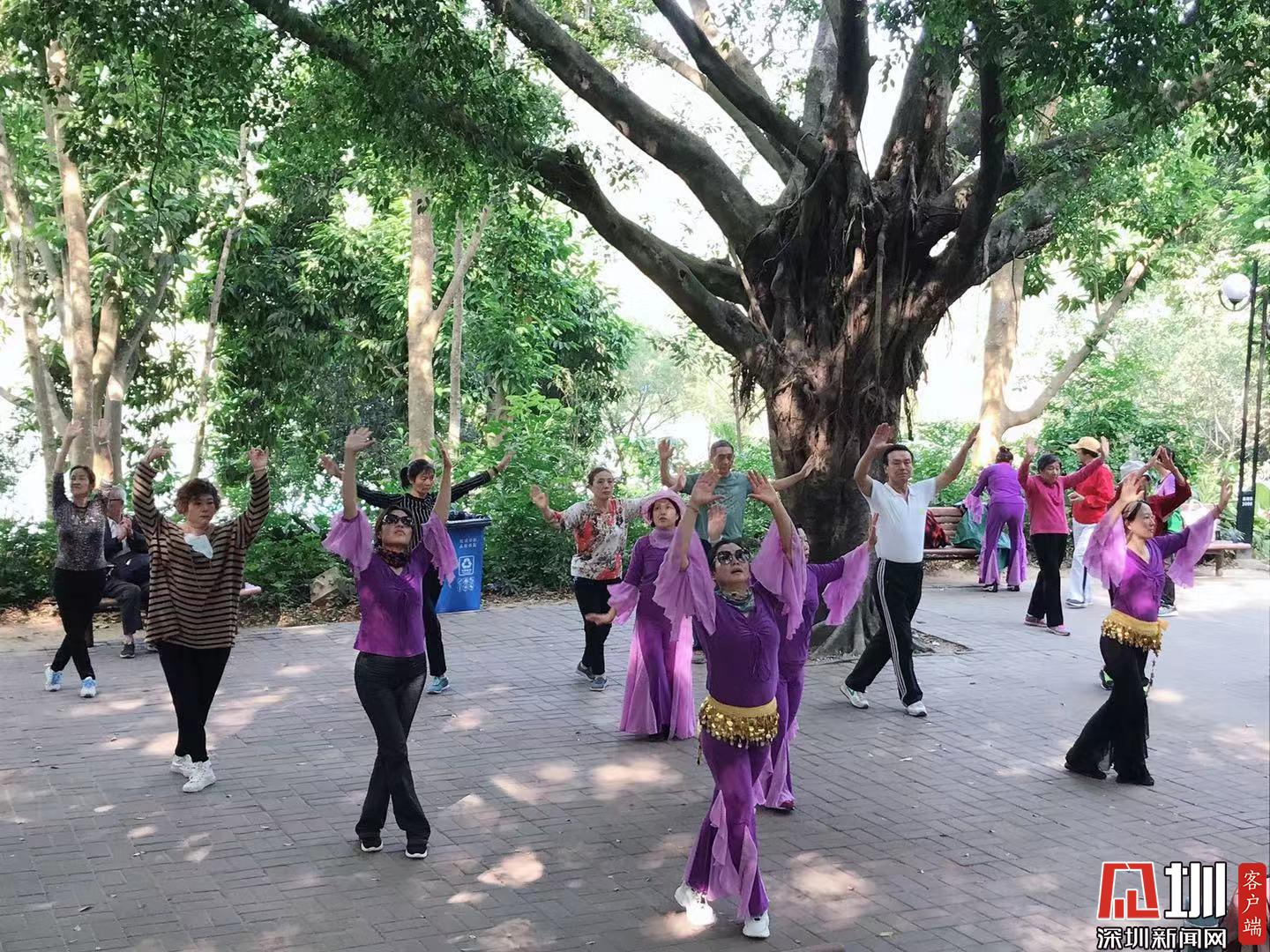 市民在蓮花山集體晨練,秩序井然,文明運動。