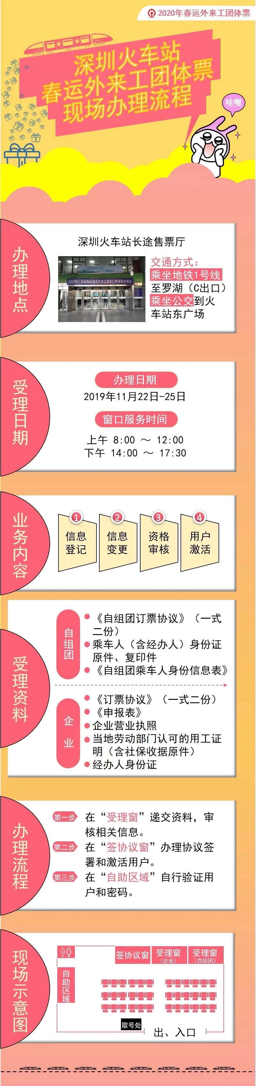 深圳特區(qū)報2019年11月22日訊 記者從深圳火車站獲悉,2019年11月22日—25日期間,訂票企業(yè)(自組團)可到深圳火車站集中辦理新企業(yè)(自組團)登記、老企業(yè)(自組團)信息變更、自組團身份信息提交、資格審核、用戶激活等一條龍業(yè)務,詳情請看下圖↓↓↓