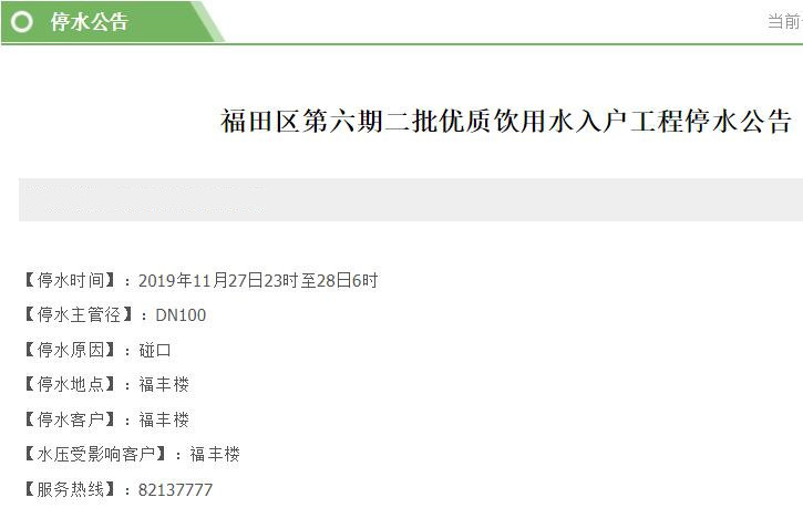 停水客戶:東華物業(yè)、中國建筑第四工程有限公司、南油小學(xué)、東華假日公寓、深圳書城物業(yè)管理有限公司、中國建筑第四工程局有限公司、深圳市南山區(qū)城市管理局(文心公園)、深圳市萬商物業(yè)管理有限公司
