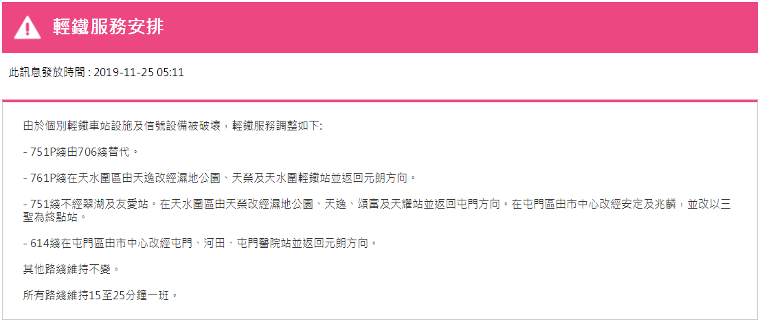 據(jù)港鐵消息,11月25日,香港地鐵各線(機場快線除外)、輕鐵及港鐵巴士的服務(wù)將于晚上11時結(jié)束。紅磡站恢復(fù)列車服務(wù),但只開放B、C出入口。大學(xué)站繼續(xù)關(guān)閉,列車不停大學(xué)站,個別車站出入口也會暫時關(guān)閉。