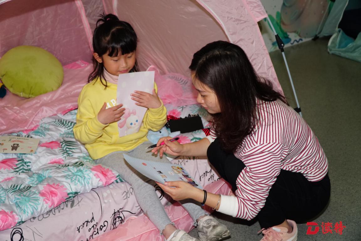 經(jīng)過(guò)茶歇小憩之后,親子游戲讓孩子們樂(lè)不可支,在呼啦圈游戲中東穿西撞,在九宮格游戲中交朋結(jié)友,在去哪兒游戲里找不著北……這一晚的熱烈在閱讀推廣人鄧歡姐姐的晚安故事中沉淀下來(lái),靜下心來(lái)寫下給未來(lái)自己的一封信。帳篷、星燈、繪本、游戲,給這30個(gè)親子家庭營(yíng)造了一個(gè)個(gè)奇妙的童話夢(mèng)境。