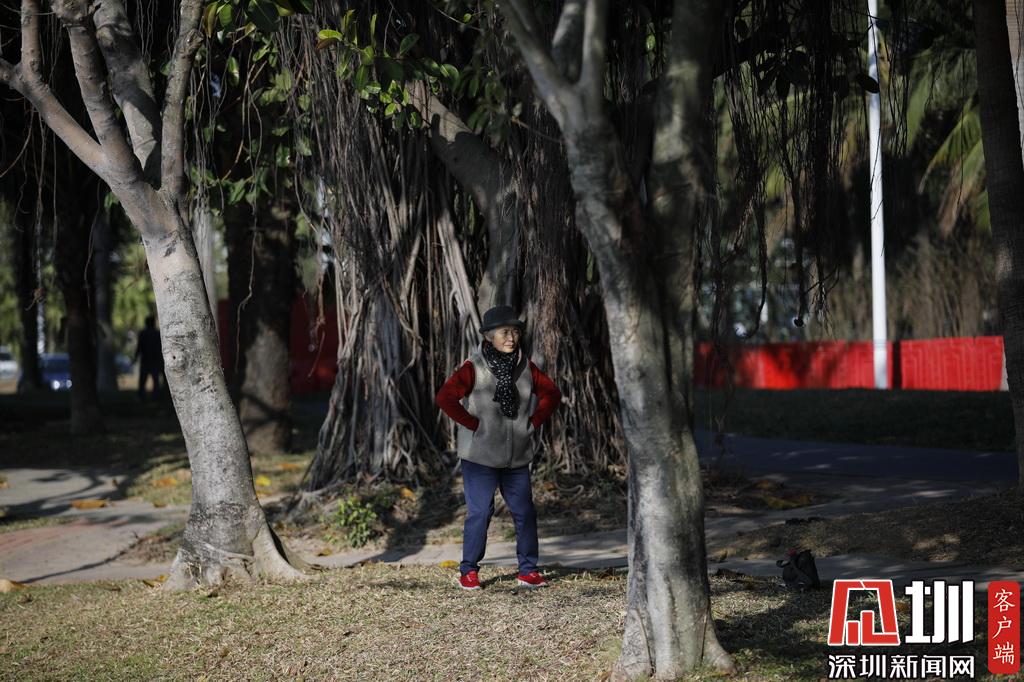 深圳灣公園,一位市民穿著羽絨服出行。