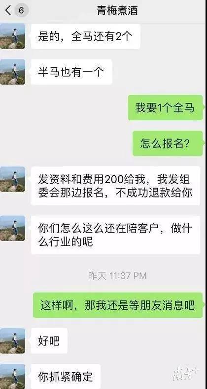 11月28日,一個網(wǎng)名為“青梅煮酒”的跑友在多個跑友群中發(fā)布了關(guān)于出售“深馬”參賽名額的消息。多名跑友私信聯(lián)系轉(zhuǎn)賬,沒想到付款后卻立即被拉黑。《深馬開跑在即,花兩百元可買名額?多名跑友微信轉(zhuǎn)賬被騙》
