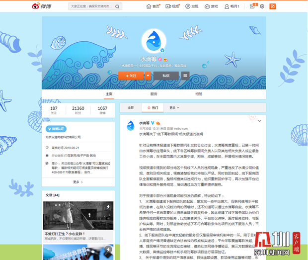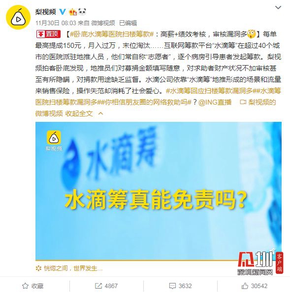 見圳客戶端.深圳新聞網(wǎng)2019年12月6日訊(見圳客戶端、深圳新聞網(wǎng)記者 張玲)2019年11月30日,據(jù)梨視頻報道,互聯(lián)網(wǎng)籌款平臺“水滴籌”在超過40個城市的醫(yī)院派駐地推人員,線下地推服務(wù)人員被指在醫(yī)院“掃樓”尋找求助者,套用模板,隨意填寫金額,不審核甚至隱瞞求助者財產(chǎn)狀況,鼓勵患者大量轉(zhuǎn)發(fā)籌款信息。同日,水滴籌通過微博官方認(rèn)證公眾號回應(yīng)稱,已第一時間成立緊急工作小組開展相關(guān)情況排查,同時線下服務(wù)團(tuán)隊(duì)全面暫停服務(wù),整頓徹查類似違規(guī)行為,并對梨視頻報道可能引發(fā)的誤解進(jìn)行了3點(diǎn)說明。