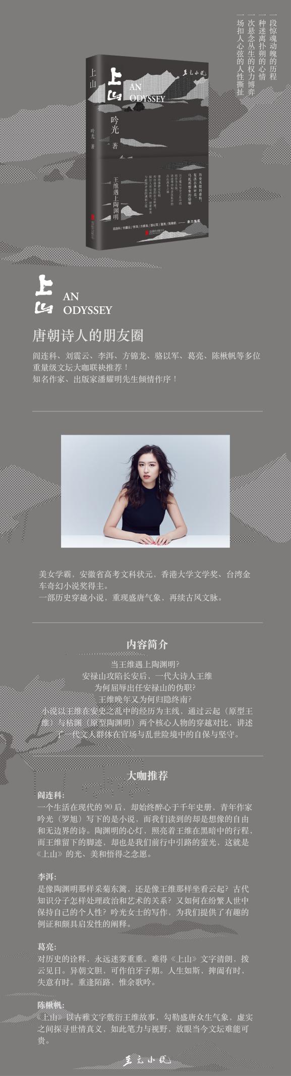 著名作家閻連科表示:“一個生活在現(xiàn)代的90后,卻始終醉心于千年史冊,青年作家吟光(羅旭)寫下的是小說,而我們讀到的卻是想像的自由和無邊界的詩。陶淵明的心燈,照亮著王維在黑暗中的行程;而王維留下的腳跡,卻也是我們前行中引路的螢光。這就是《上山》的光、美和悟得之念愿?!?/p>